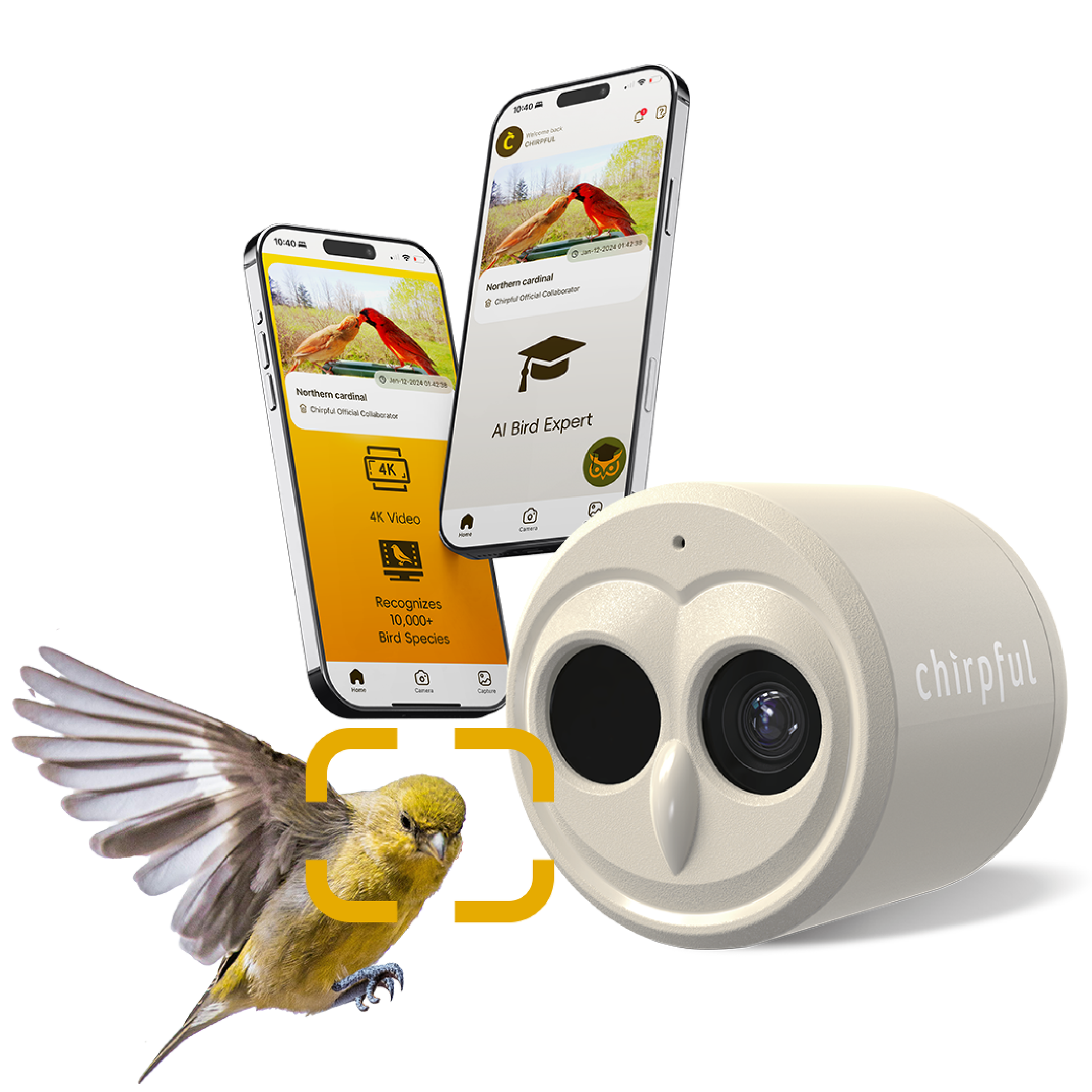 Paired with the Chirpful mobile app, users can watch birds in real time, save photos and videos, and learn more about the species visiting their yard.