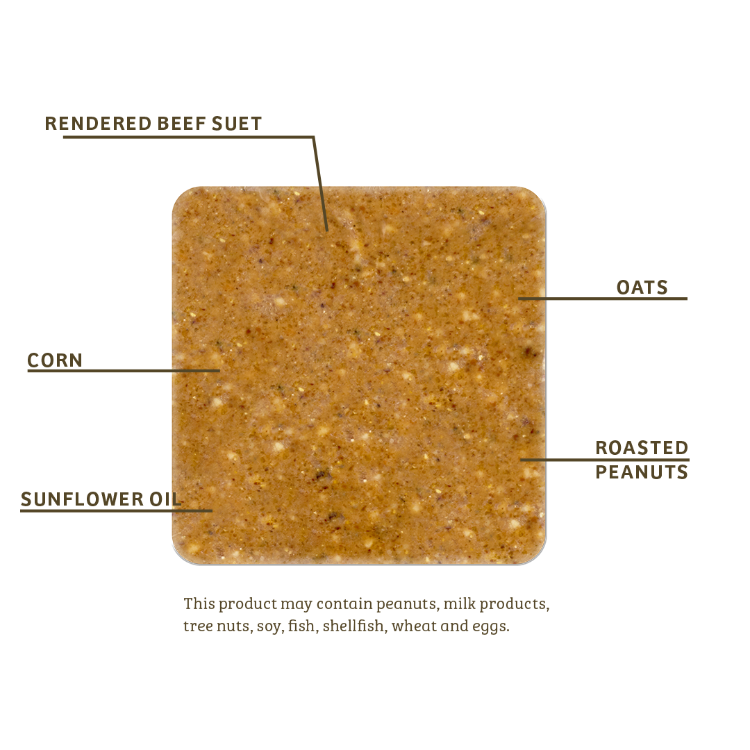 Ingredients: Roasted Peanuts, Corn, Rendered Beef Suet, Oats, Sunflower Oil.